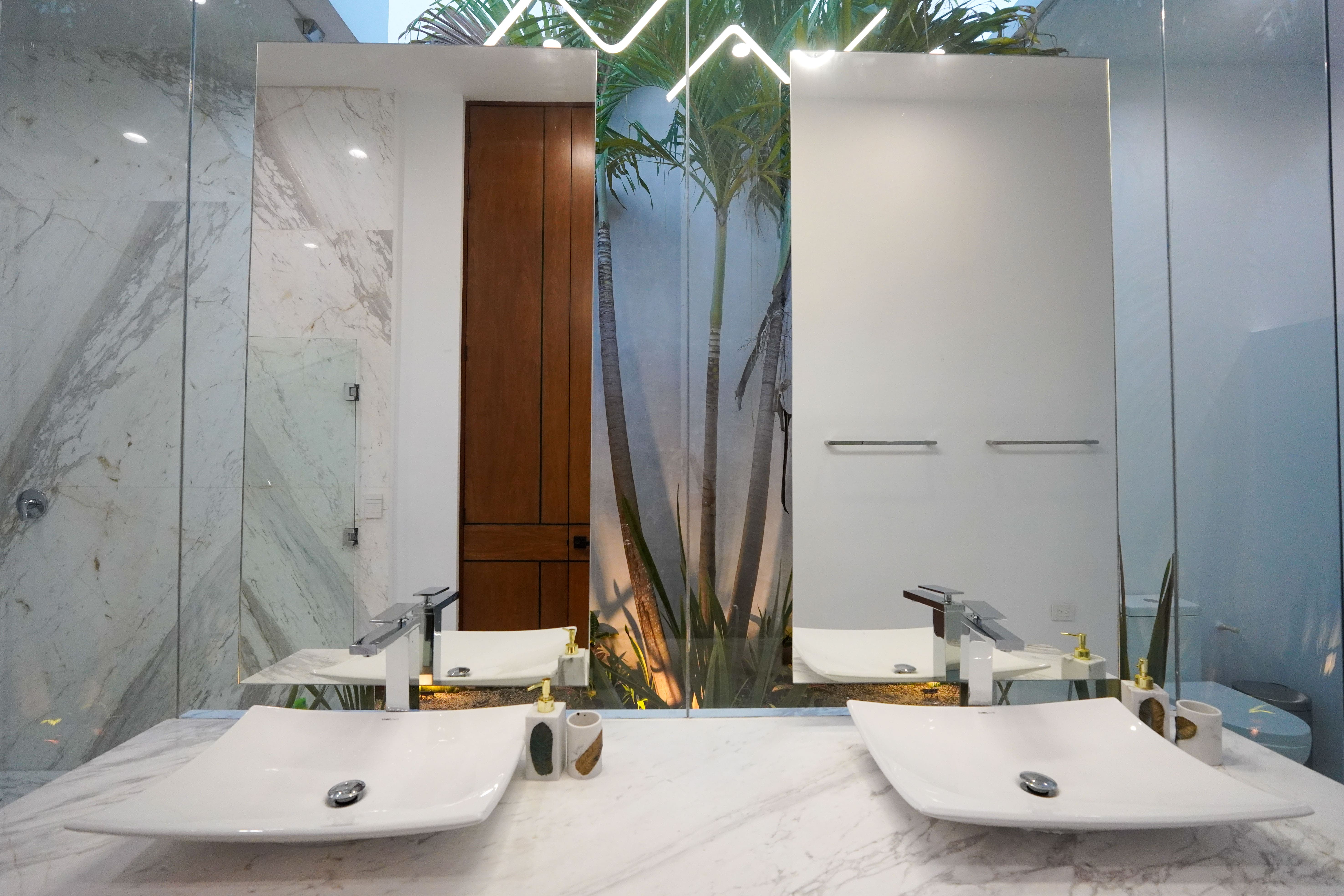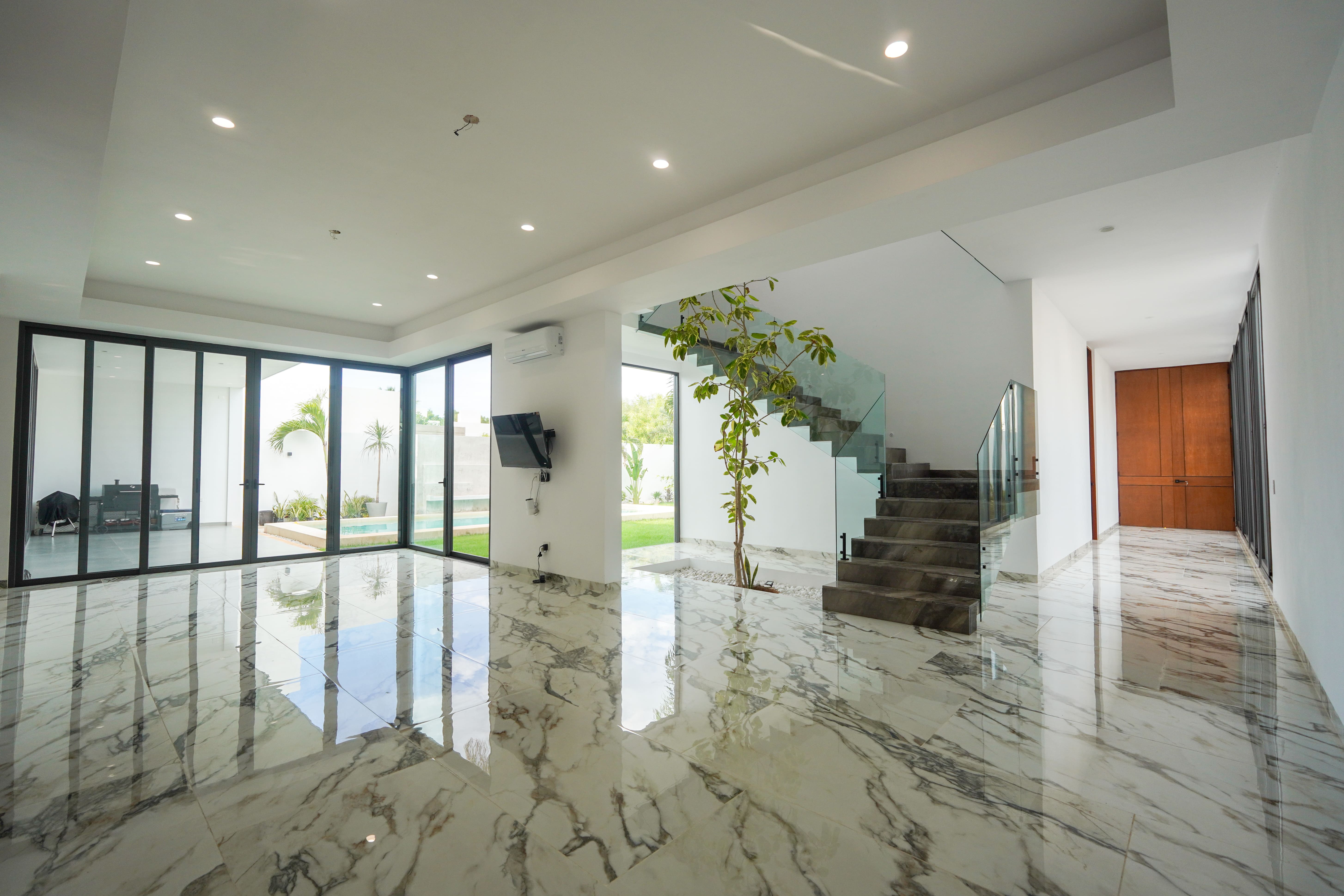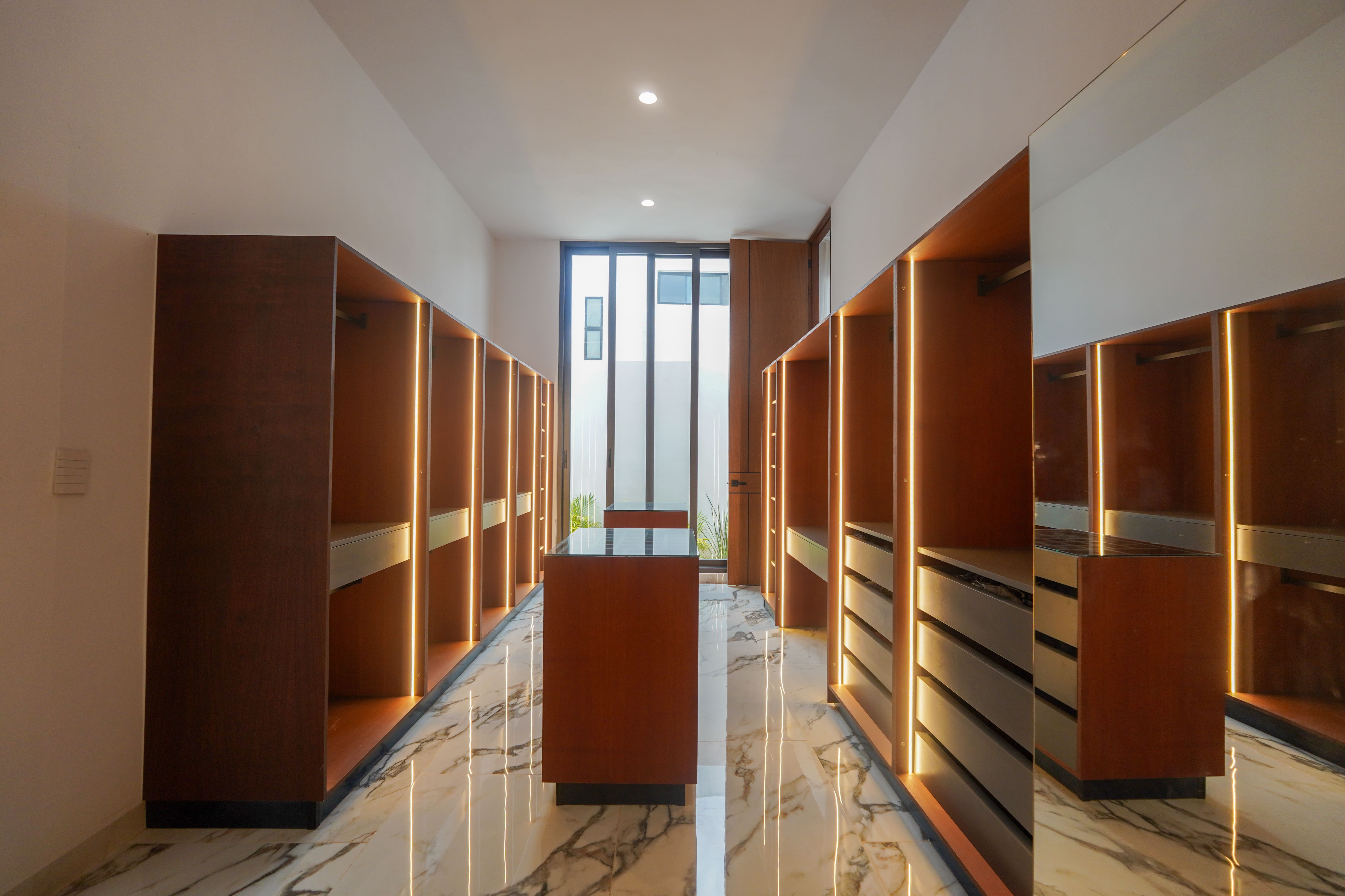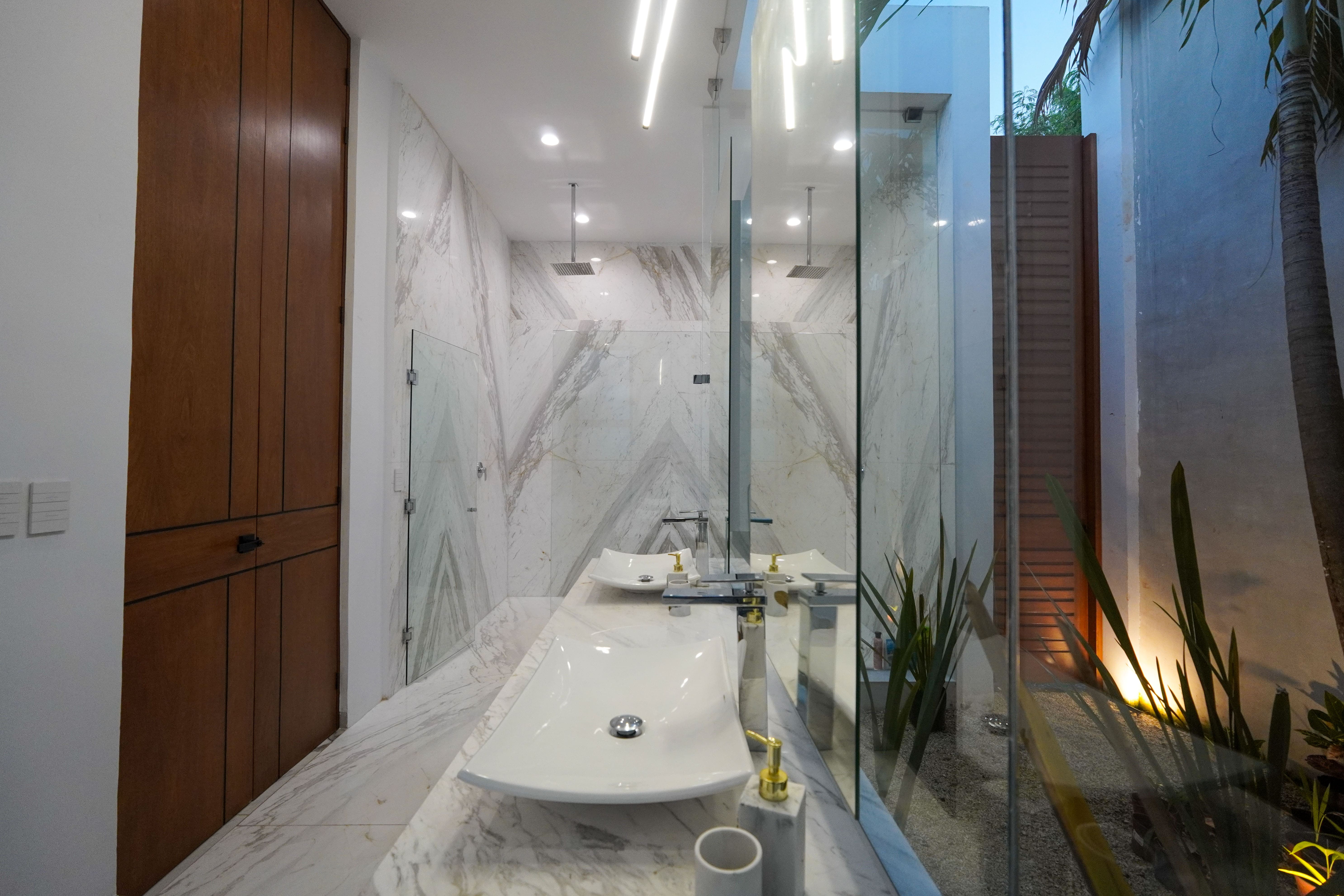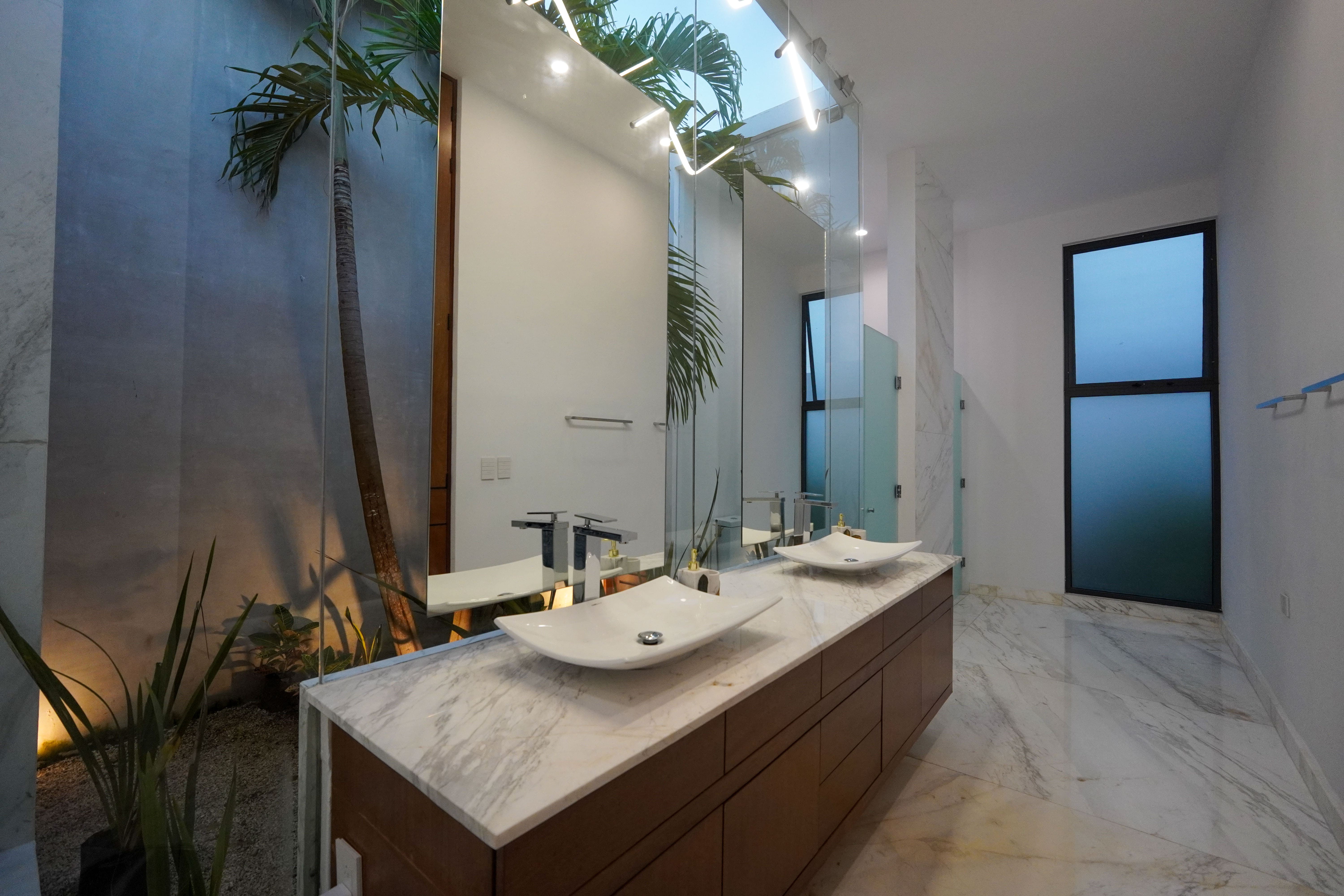 Desde el área de estar, que se conecta directamente con la cocina, un corredor con vistas a un jardín lateral conduce a las demás recamaras que se encuentran en la planta baja, una de ellas la principal, la cual cuenta con un estupendo closet vestidor y un baño inspirado en los baños turcos.