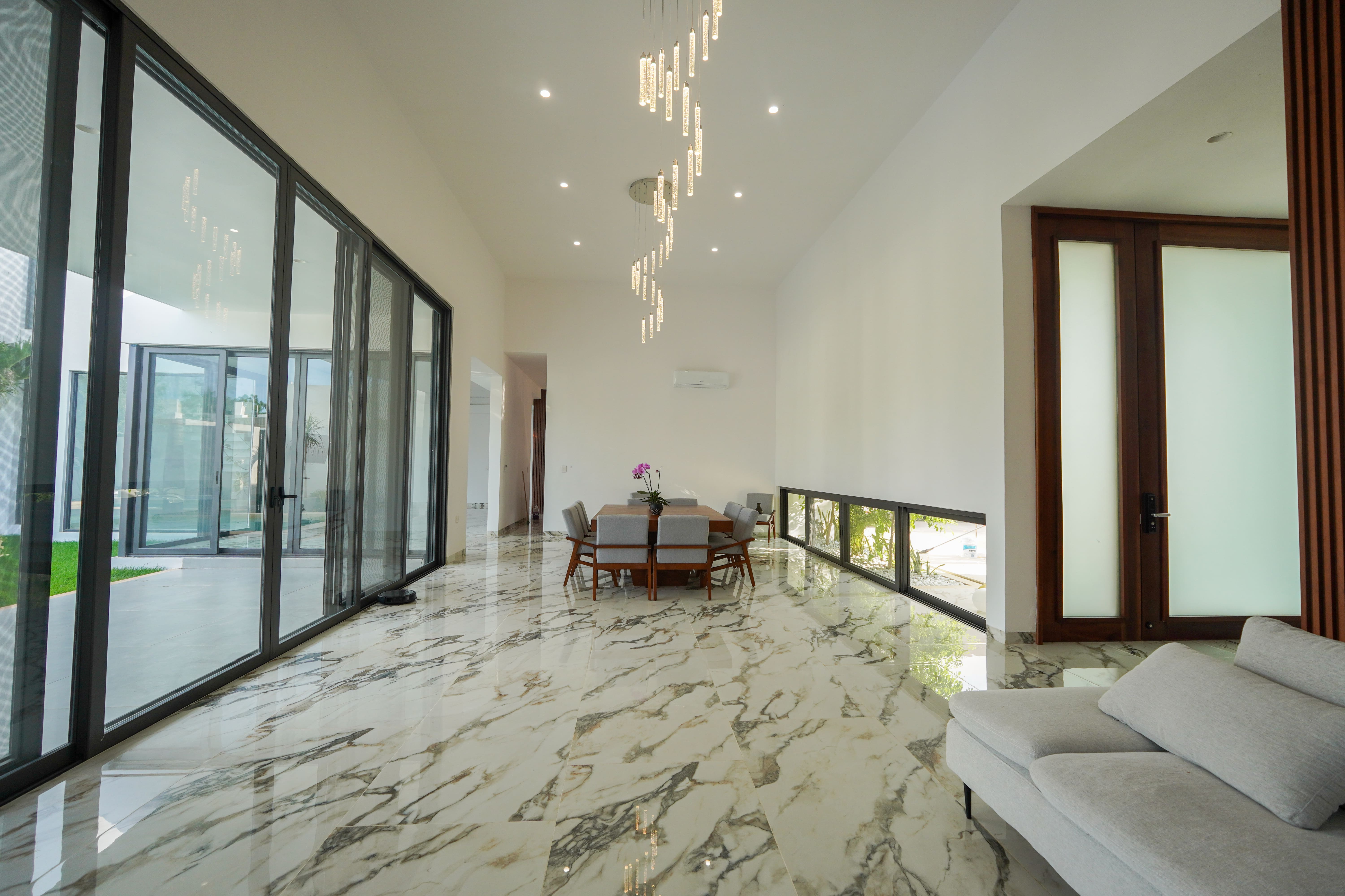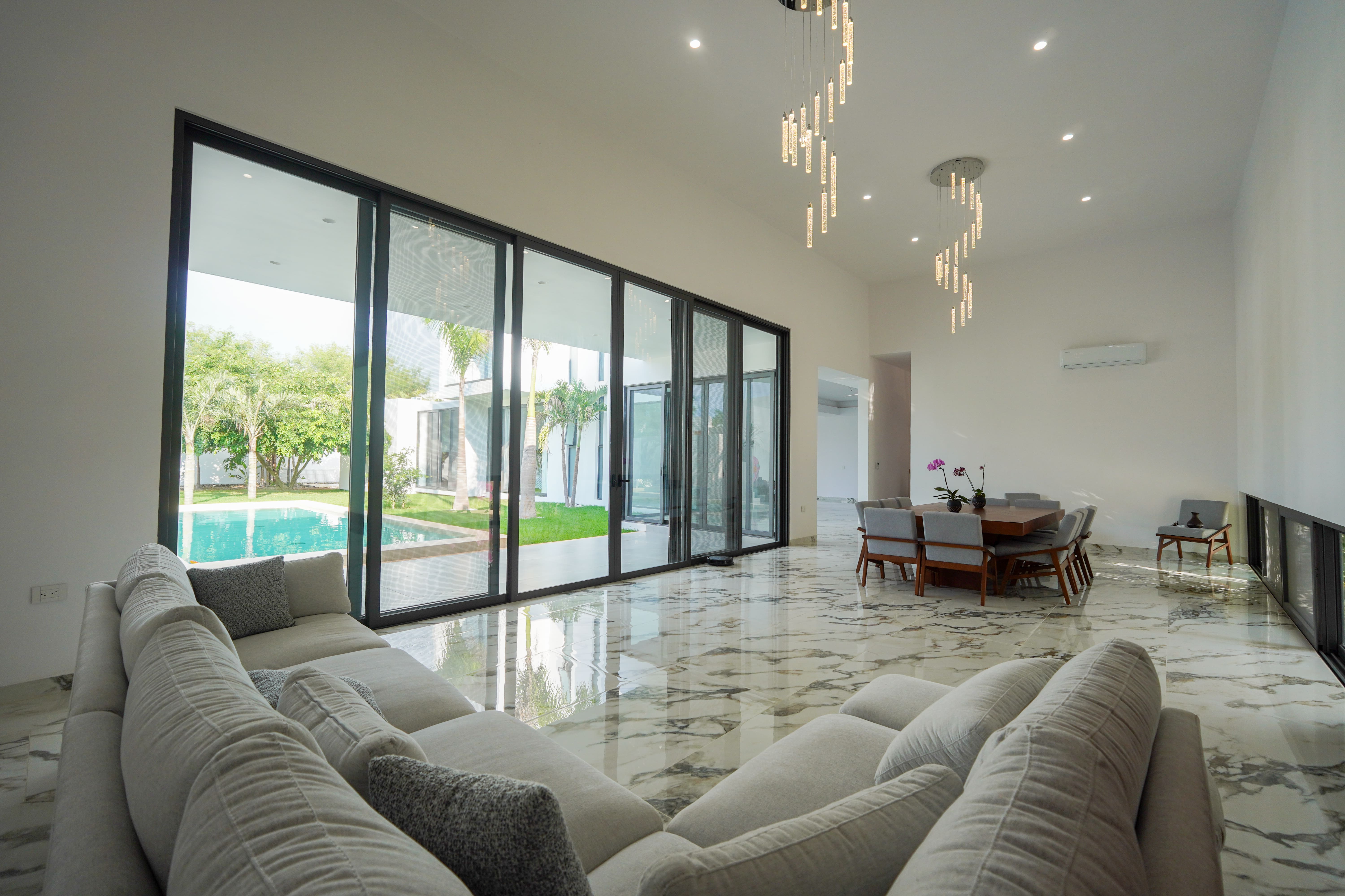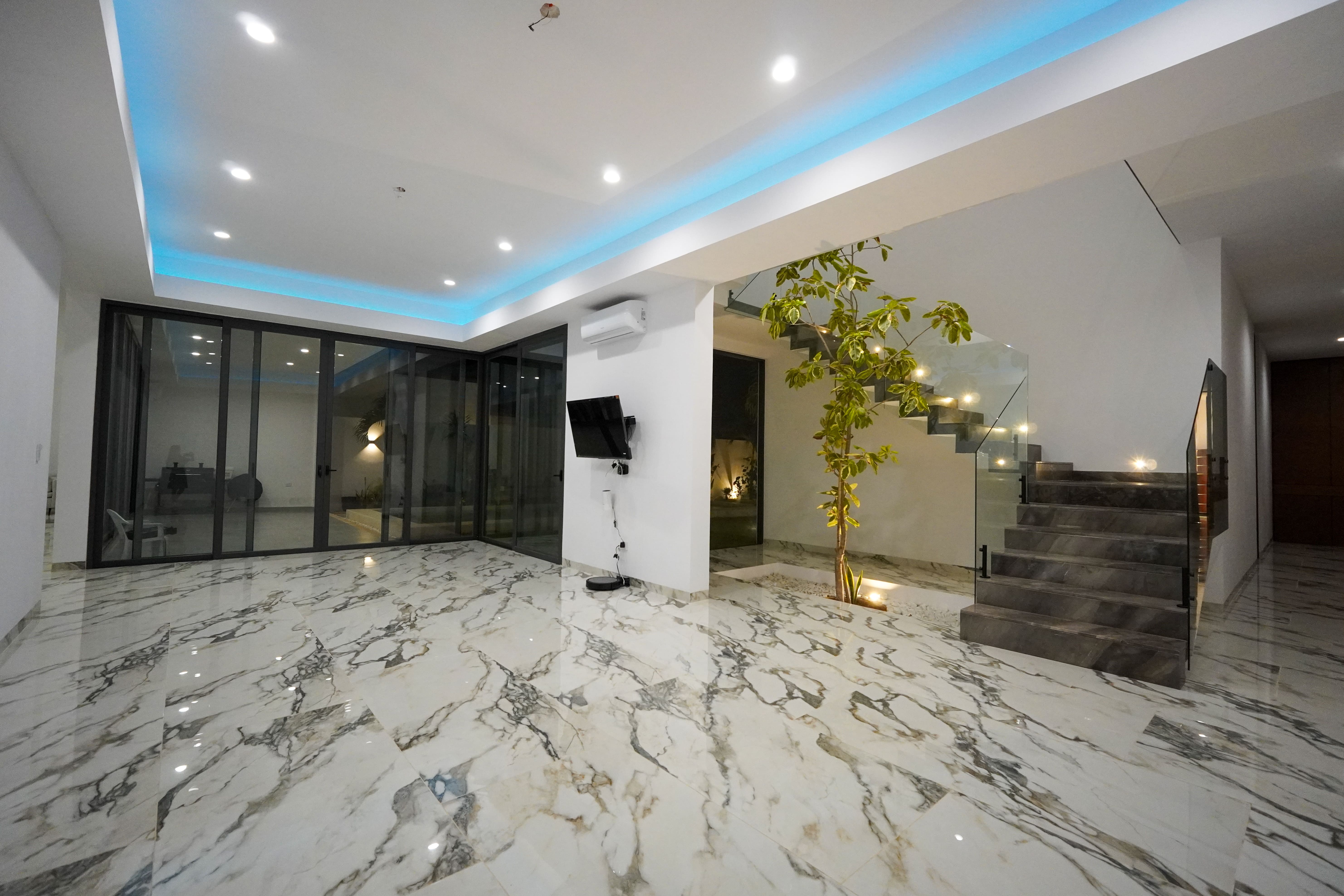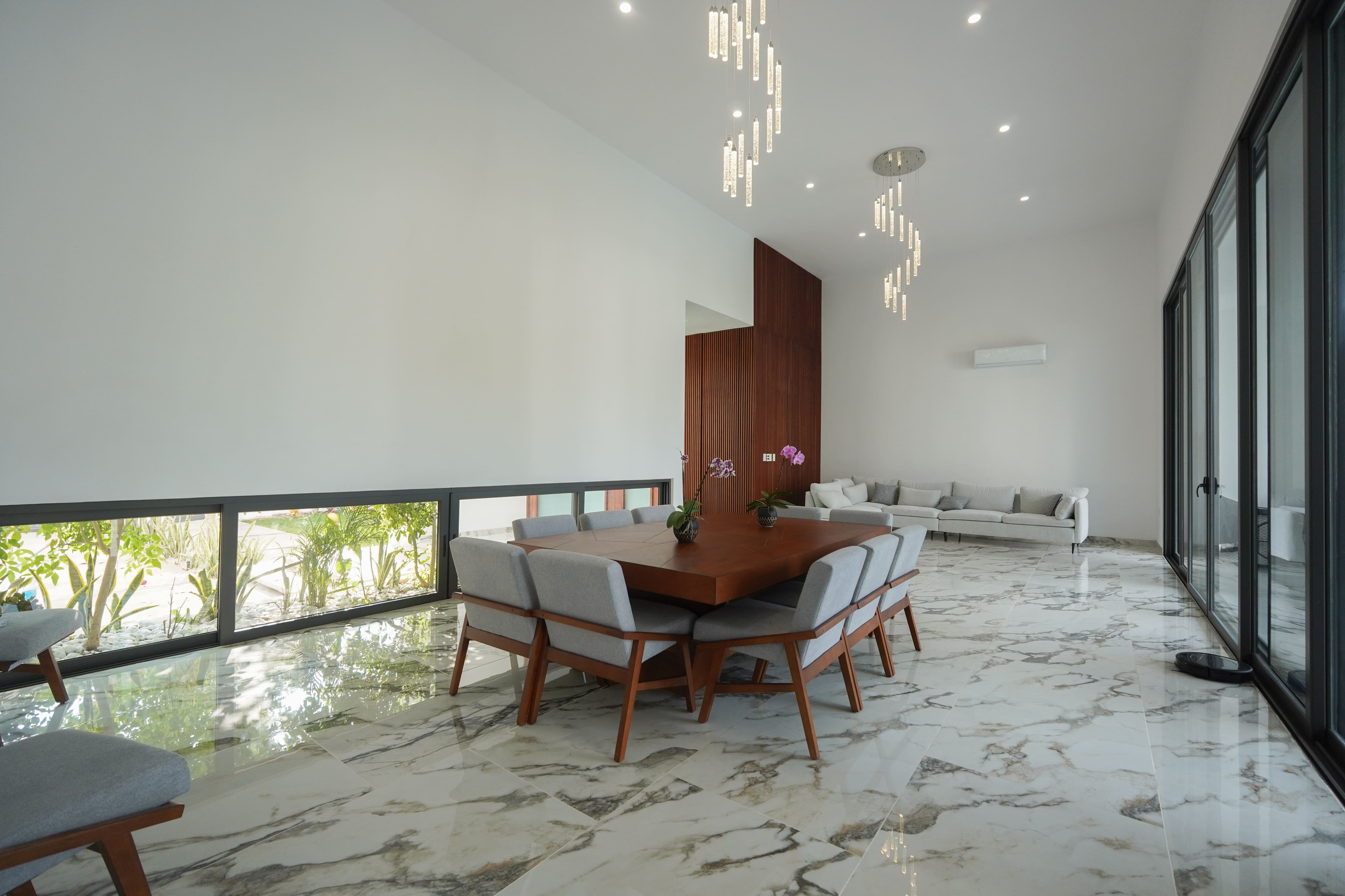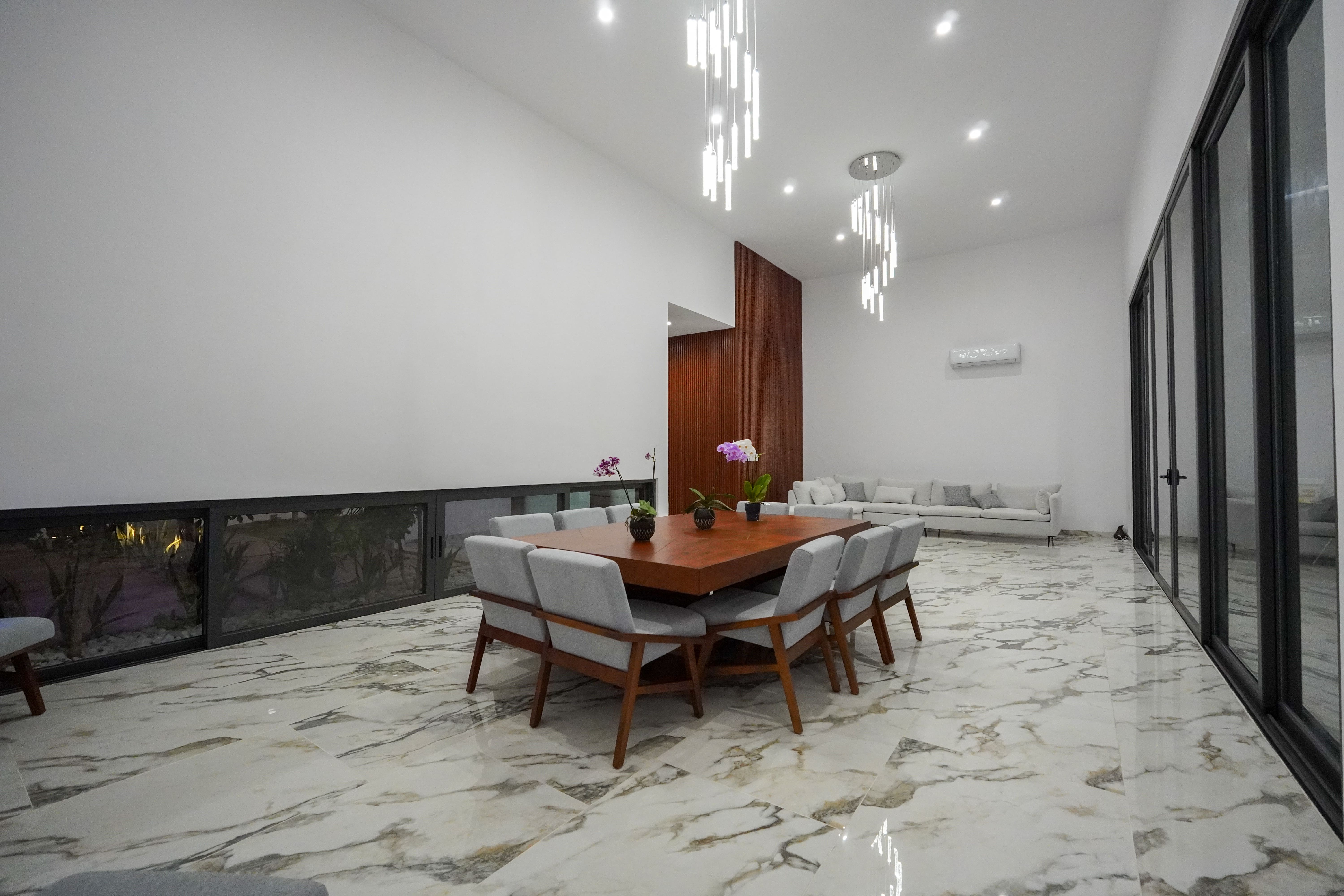 Dentro, un vestíbulo te recibe, permitiendo un ingreso gradual a los espacios principales como la sala y el comedor. Estos se elevan a una altura y media, y destacan por sus ventanales de gran tamaño que conectan visual y funcionalmente con la terraza, el patio y la alberca. La sala y el comedor también vinculados a la cocina y a un área de estar que tiene una circulación vertical, escalera, que da acceso a un área privada que alberga, una recámara, una oficina privada y un gimnasio.