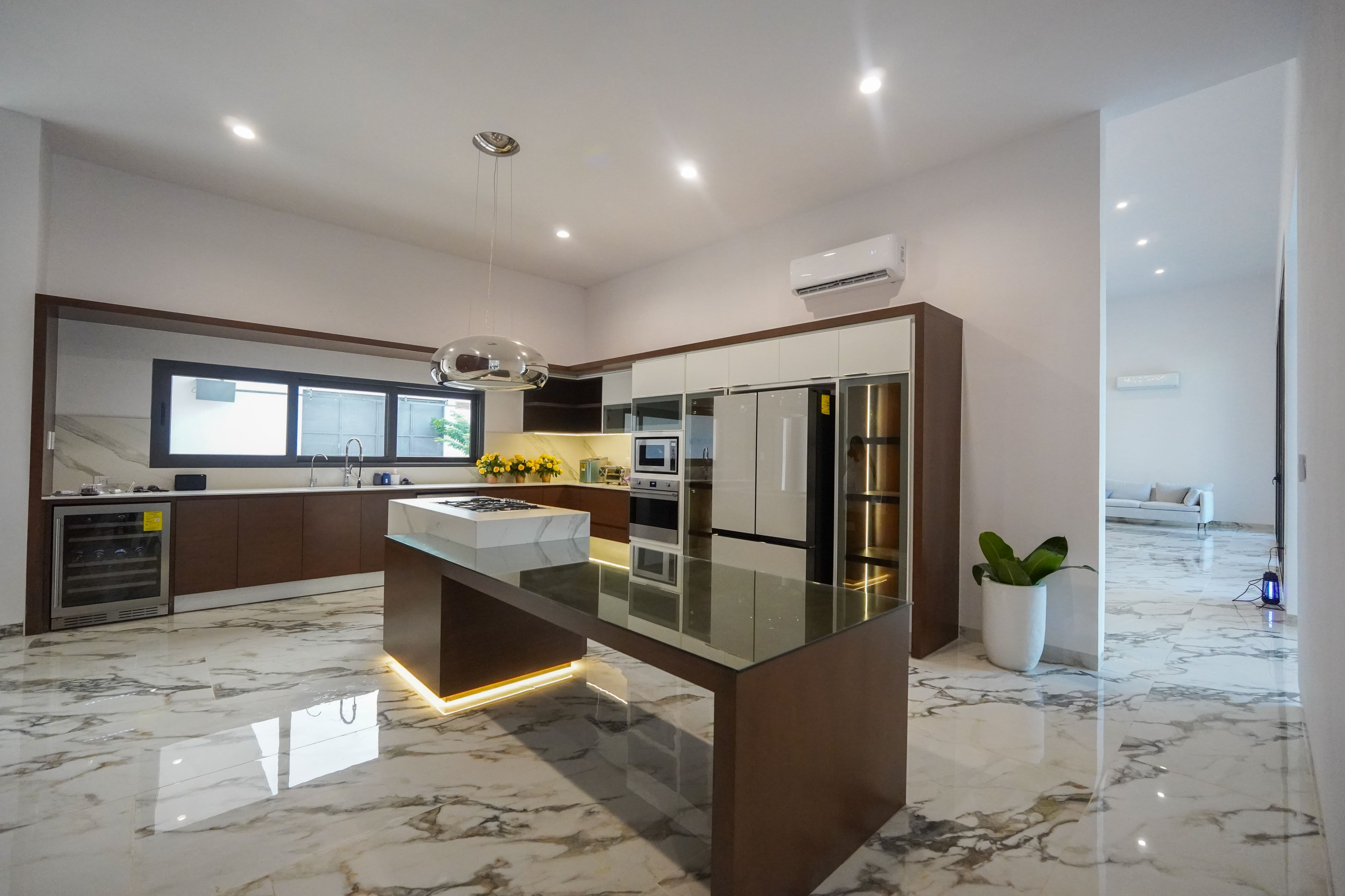 Un tema aparte es la cocina, la cual fue diseñada meticulosamente, cada cosa en su lugar, hornos, parrilla, una campana decorativa de alto perfil , alacena, y más elementos que la conforman, con un acceso oculto a el área de servicios que le da limpieza al diseño, al no contar en si con puertas visibles a esta área.
