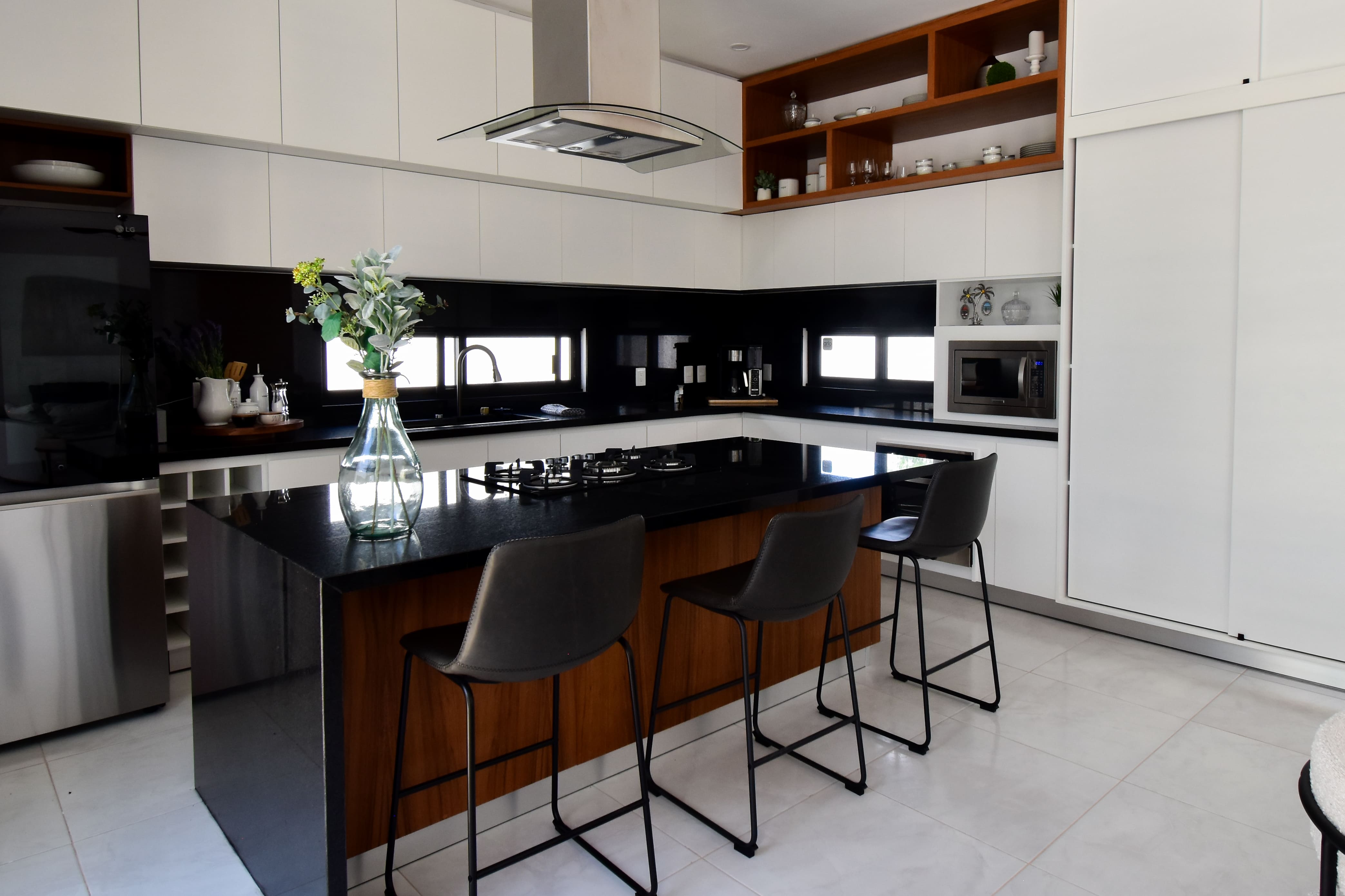 La cocina, equipada con tecnología moderna, ha sido diseñada pensando en la practicidad y el orden. Cuenta con una alacena que maximiza el almacenamiento y organiza los elementos esenciales para la preparación de alimentos.